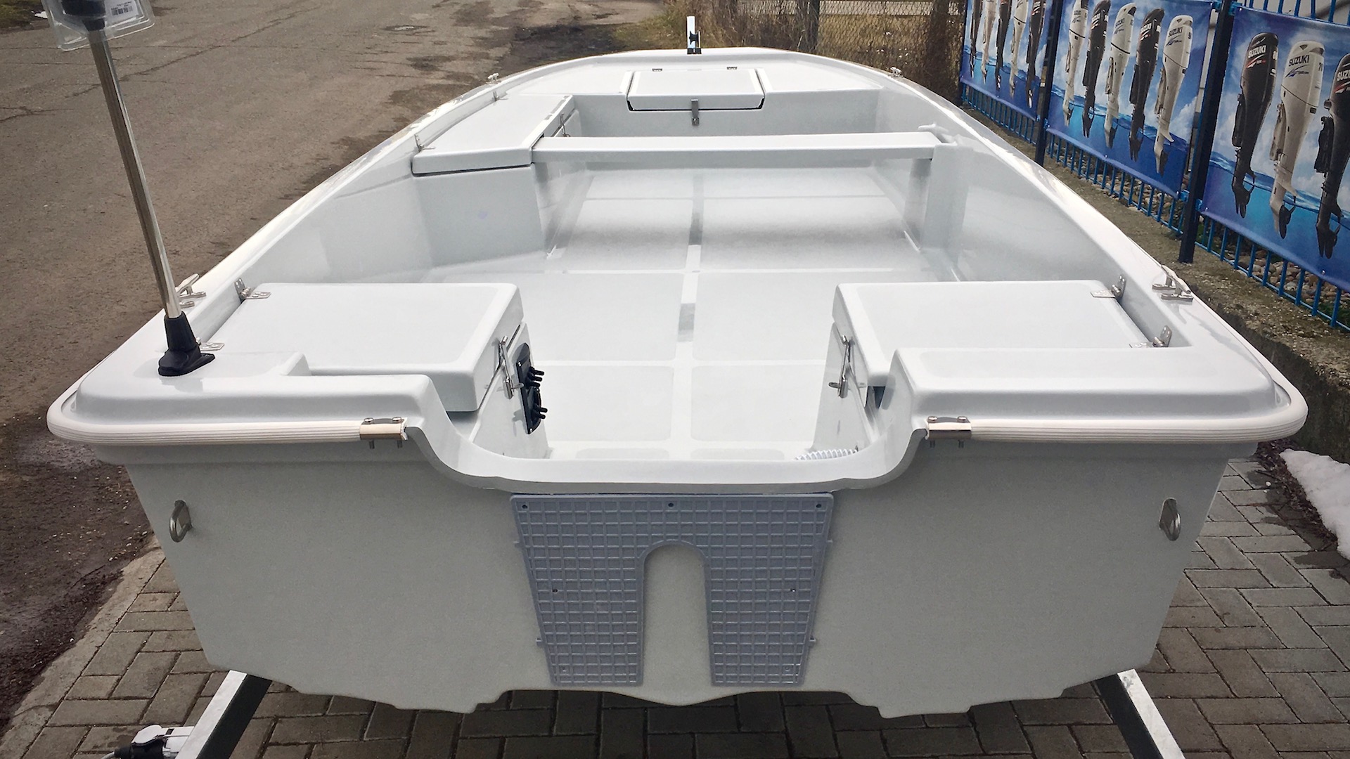 A Hírös Yacht saját fejlesztésű katamarán jellegű horgászcsónakja, 4 db hatalmas tárolóval,